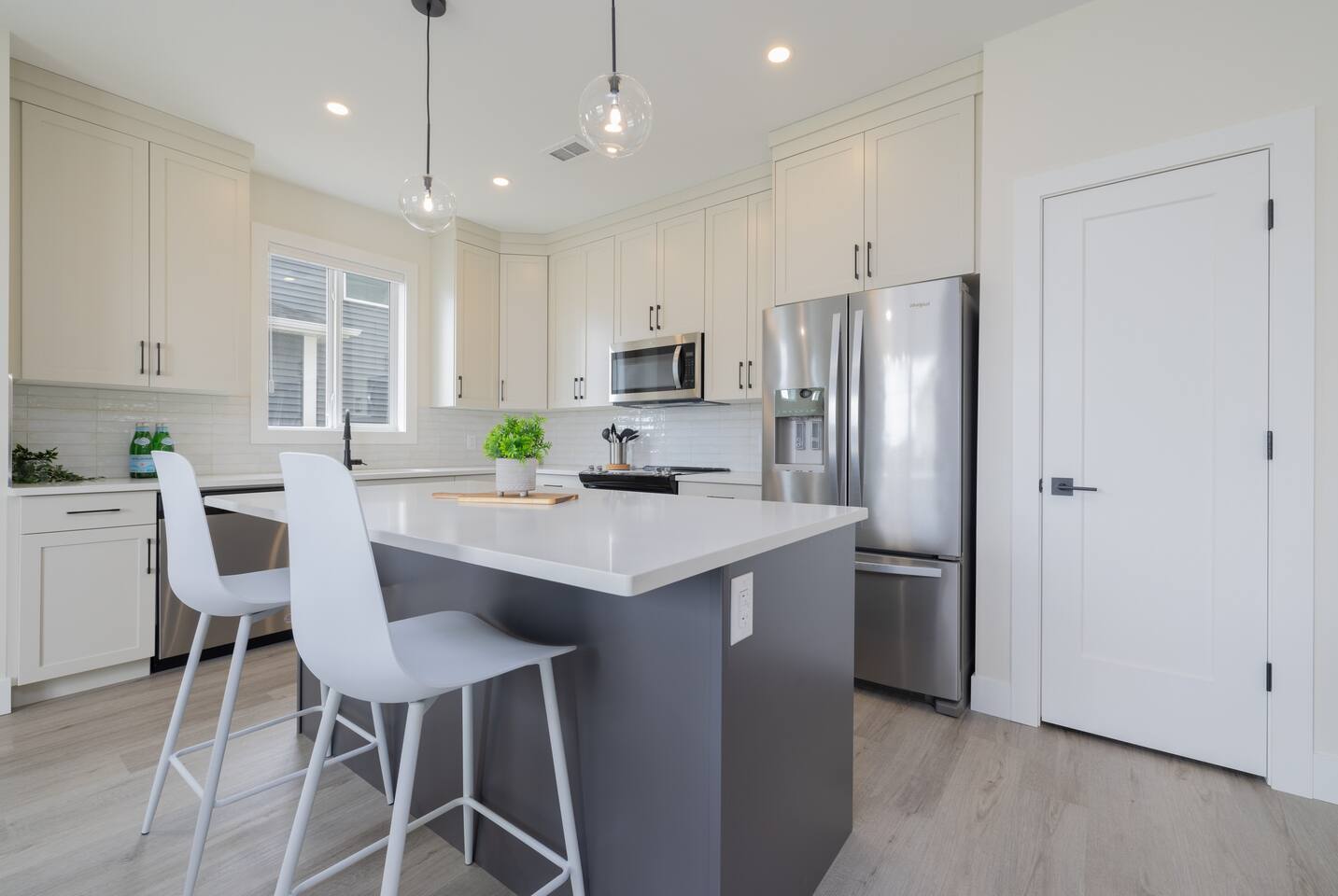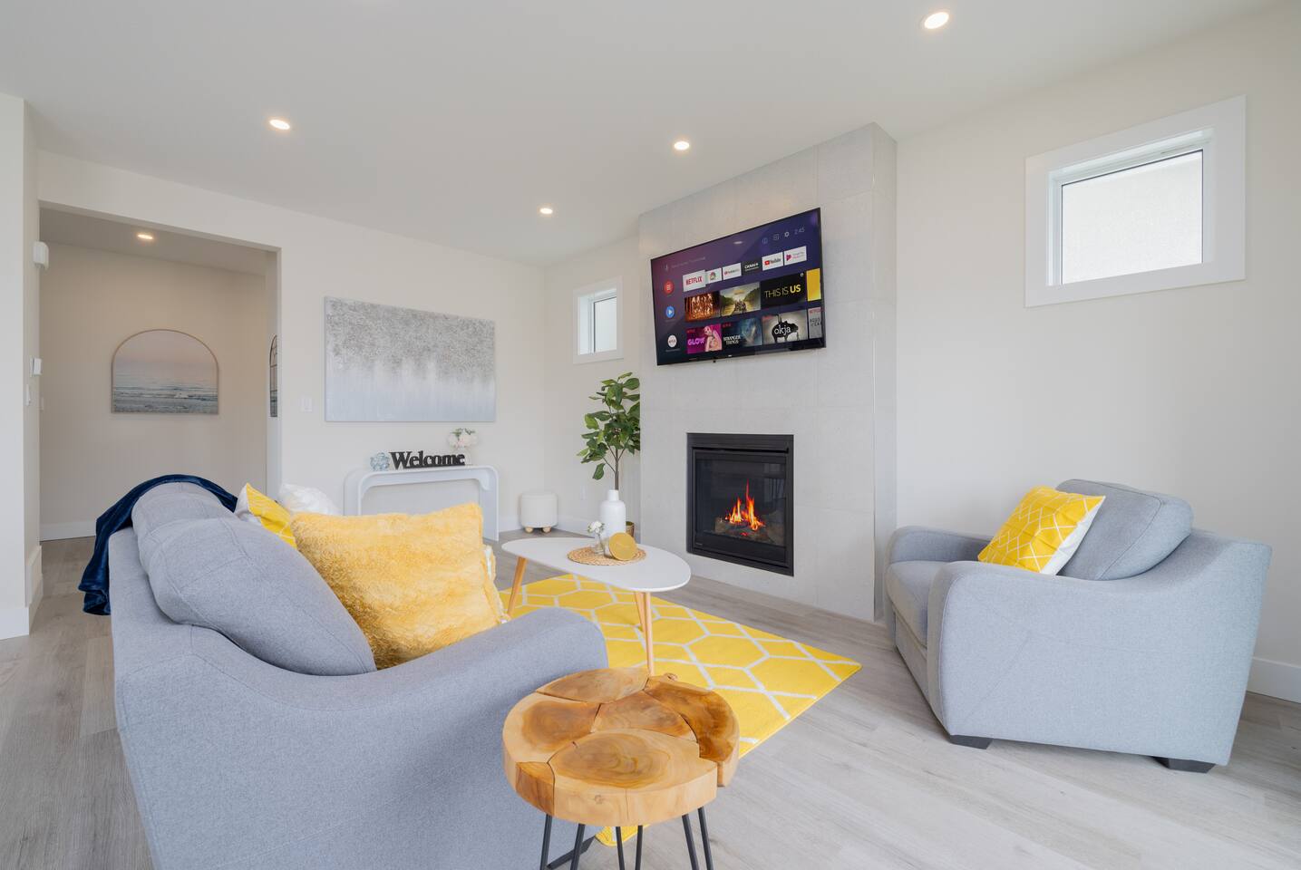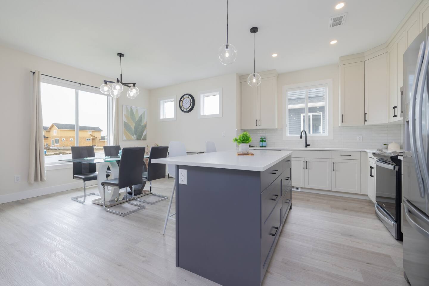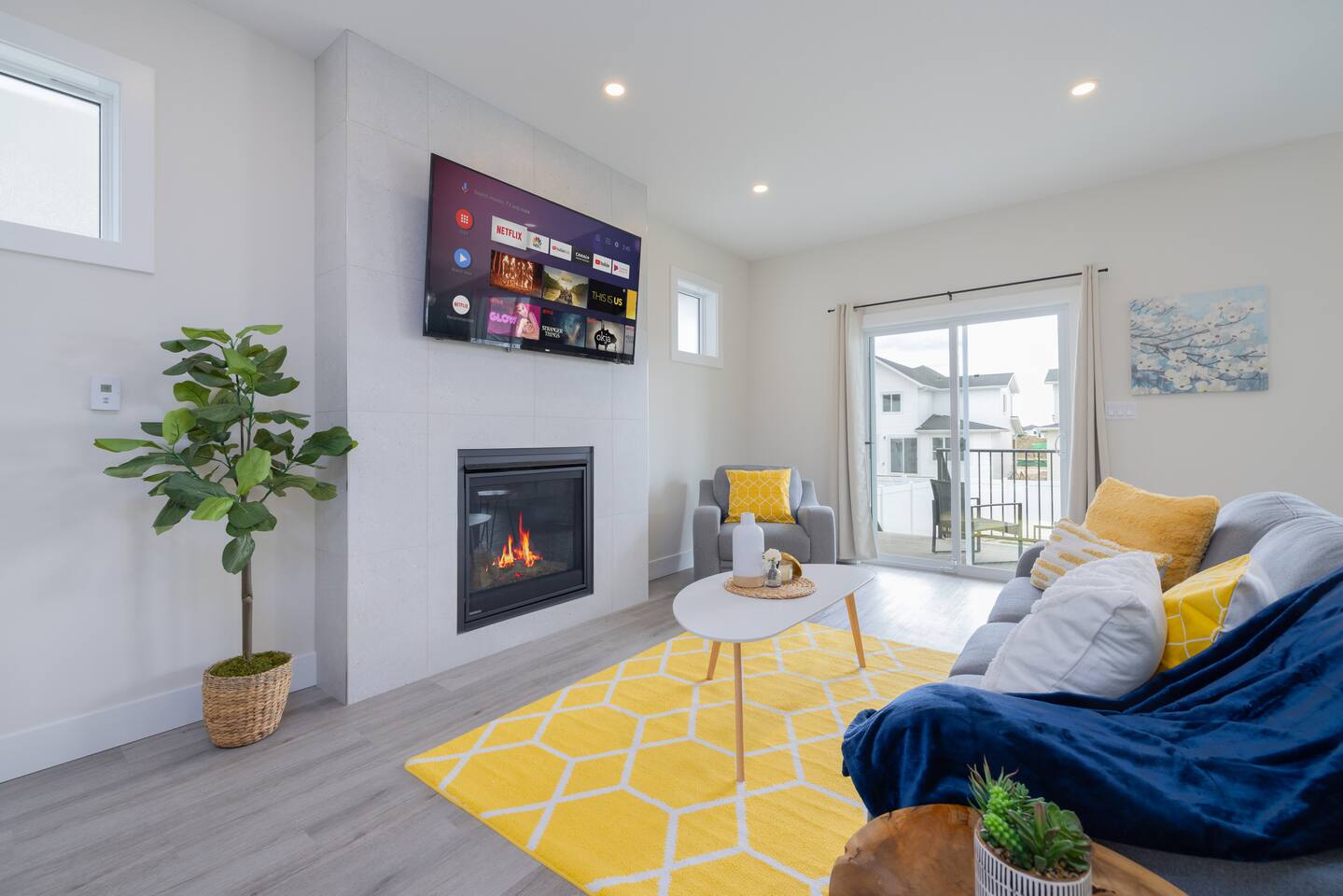 Spacious Living Areas: The open-concept main floor features a designer kitchen with top-tier finishes, large windows that bathe the space in natural light, and a striking gas fireplace for cozy evenings. The home is equipped with two televisions for your entertainment. Outdoor Delight: Enjoy the beautifully landscaped and fully fenced front and back yards, a covered deck with a Weber propane BBQ, and maintenance-free artificial turf. Convenience & Comfort: The home includes a double attached insulated garage, a concrete driveway and walkway, central air conditioning, electric blinds throughout, and a complete set of appliances. Prime Location: Situated near scenic trails, green spaces, and only 12 minutes from downtown, Miray provides easy access to Aspen Square, newly constructed amenities, and future schools. This home offers the perfect blend of tranquility and convenience, making it an excellent choice for your next getaway. **Accommodation** Bedrooms & Bathrooms: Relax in one of the 3 spacious bedrooms, with the option to transform the upstairs bonus room into a 4th bedroom. There are 3 modern bathrooms, including a luxurious five-piece ensuite in the master bedroom. Principle Suite: The main bedroom offers an oversized walk-in closet and a spa-like bathroom featuring a luxurious soaker tub, separate tiled shower, and dual sinks with quartz countertops and soft-close cabinetry.