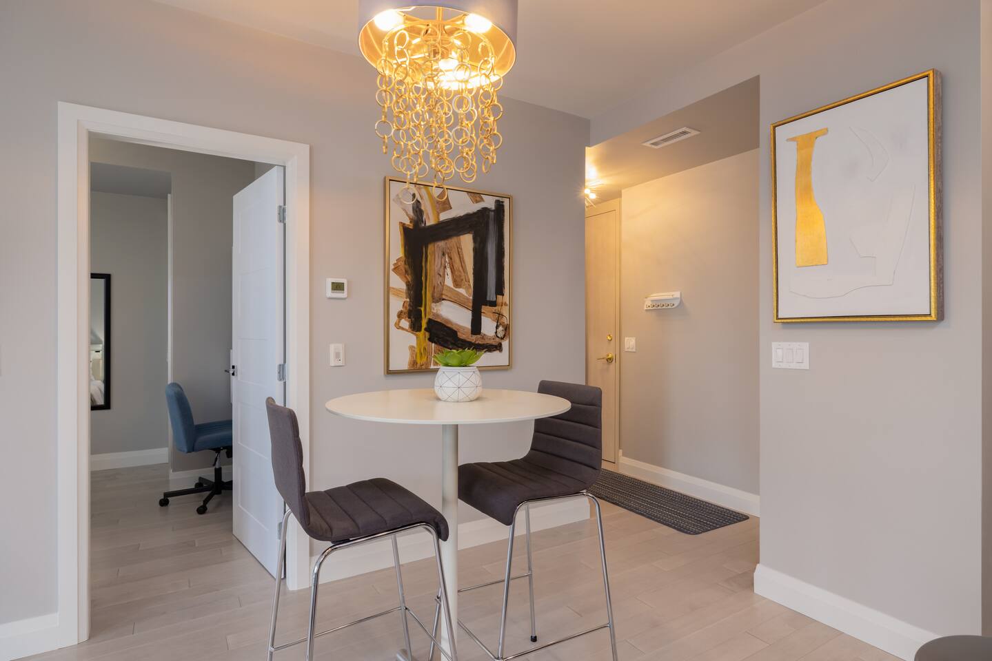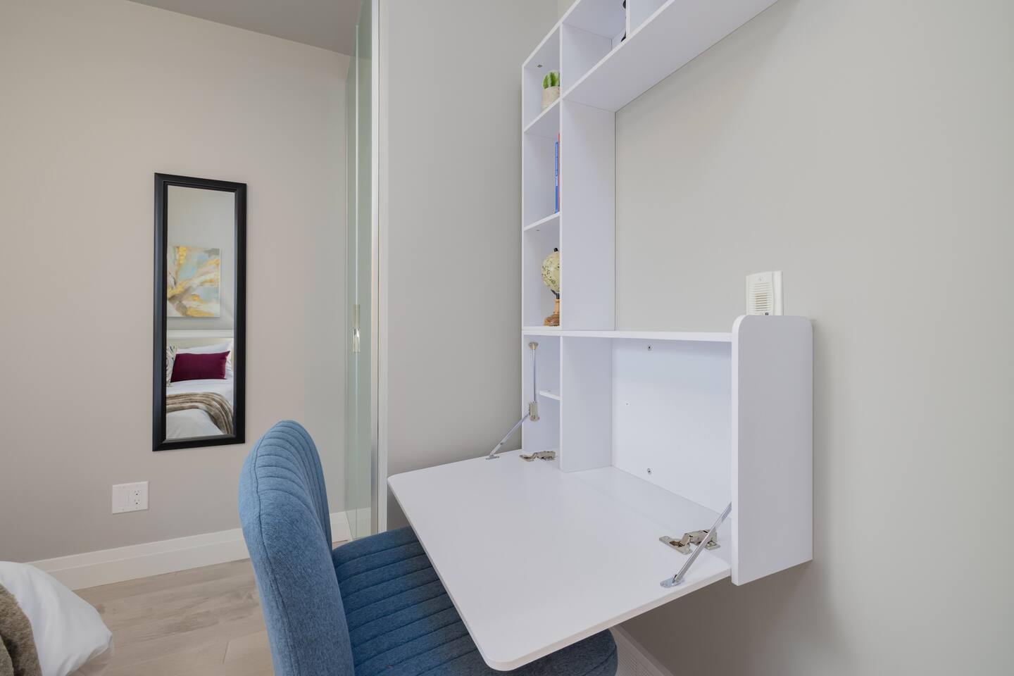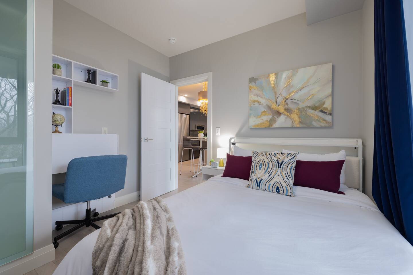 The unit has two bedrooms and two full bathrooms. The fully equipped kitchen features soft-close cabinets, Miele appliances, and quartz countertops. The living area is open-concept with floor-to-ceiling glass, 9-foot ceilings, and all new furniture. The master suite features a walk-in closet, dual sinks, and a tiled tub/shower combo. The patio overlooks the beautiful view of University Drive and includes a natural gas hook-up for a BBQ. The unit has two underground side-by-side parking stalls and one secure storage unit. This unit is fully furnished, decorated, and supplied with all the standard essentials and equipment expected a home-away-from-home. A workstation is included in the second bedroom, well-suited for professionals. Enjoy all the extras, including an in-suite washer & dryer as well as heated underground parking and storage. This thoughtfully designed space is sure to provide maximum comfort and convenience. Pets are allowed but require owner approval.