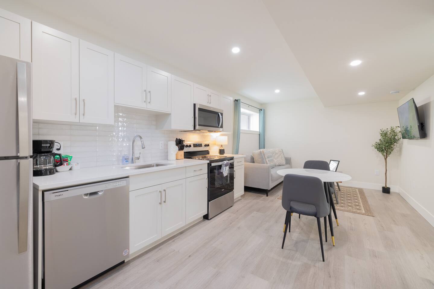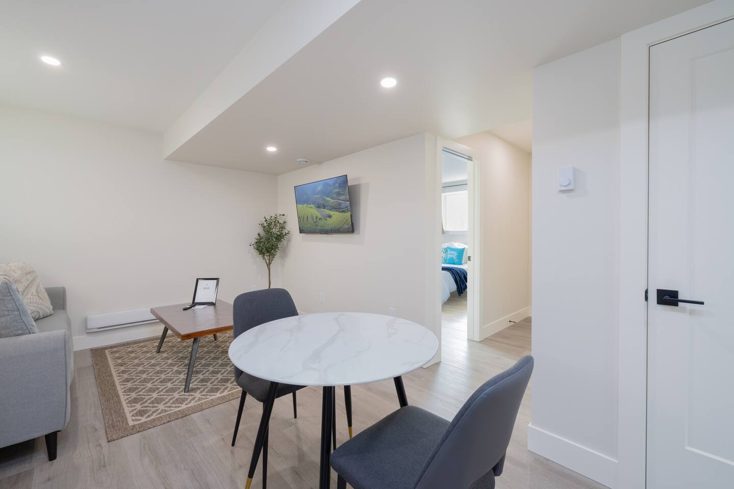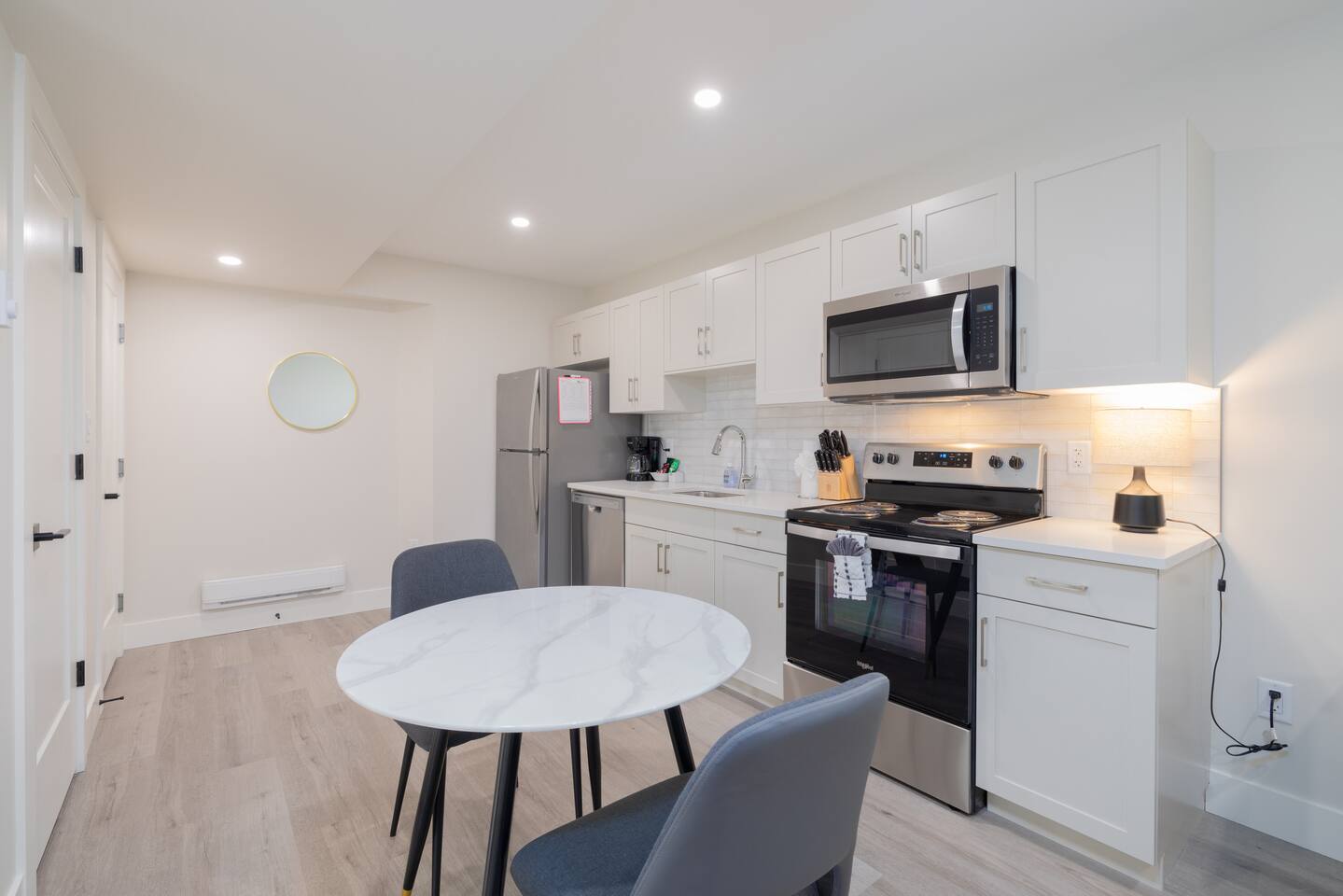 **Guest Access** Enjoy privacy and convenience with a private entrance into your suite. Driveway parking offers easy and secure vehicle storage. **Other things to note** The bedroom features a comfortable queen-sized bed with an Endy mattress, ensuring restful nights and rejuvenating sleep. The fully equipped kitchen boasts soft-close cabinetry, making meal preparation a breeze in this stylish and functional space. Relax in the living area with a 50-inch smart TV, perfect for streaming your favorite shows and movies. This pet-friendly suite also includes an in-suite washer and dryer, adding to the convenience of everyday living. Large windows provide plenty of natural light, creating a bright and welcoming atmosphere. Central air ensures year-round comfort. Located in the prestigious Aspen Ridge neighbourhood, this suite is close to local amenities, parks, and shopping, offering a perfect balance of suburban tranquility and urban accessibility.